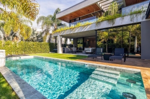 Construída em um terreno de 590 m², possui 564 m² de área construída e uma área externa impecável, com piscina aquecida e espaçosa, bar molhado, jardim com sistema de irrigação automática tanto no gramado quanto nas floreiras, além de duas áreas gourmet com churrasqueira a gás e a carvão, forno e cooktop Gorenje, e uma elegante praça de fogo.